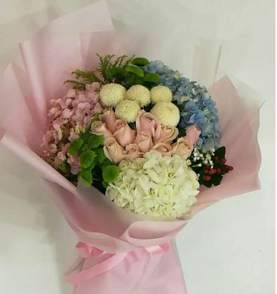 花材:三色绣球加11朵玛利亚玫瑰加乒乓菊配花精美时尚包装