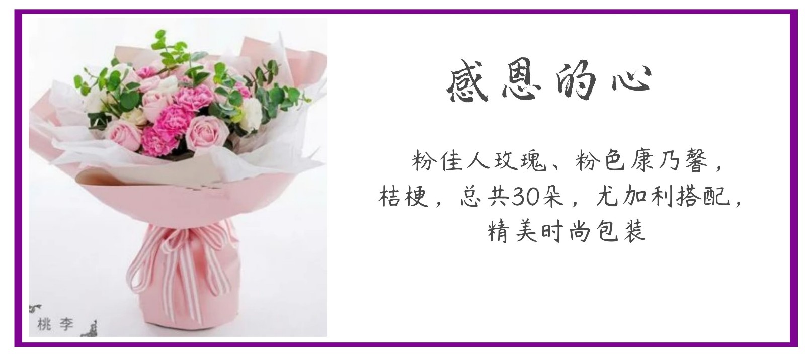 花材:粉佳人玫瑰、粉色康乃馨,桔梗,总共30朵,尤加利搭配,精美时尚包装