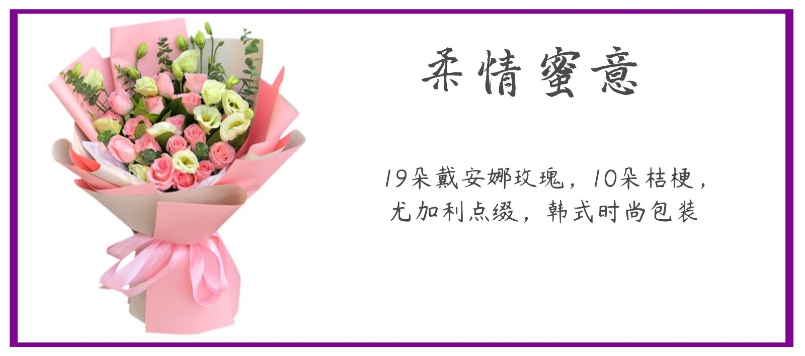 花材:19朵戴安娜玫瑰,10朵桔梗,尤加利点缀,韩式时尚包装